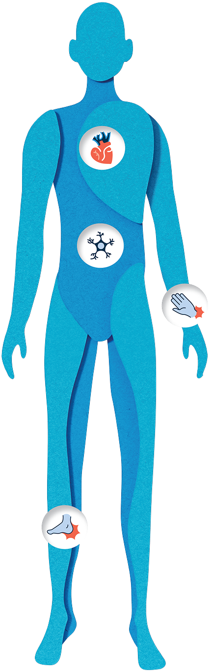 - Experiencing symptoms of nerve damage, such as a loss of sensitivity to temperature, tingling or numbness in the hands and feet, digestive issues, and sexual dysfunction.